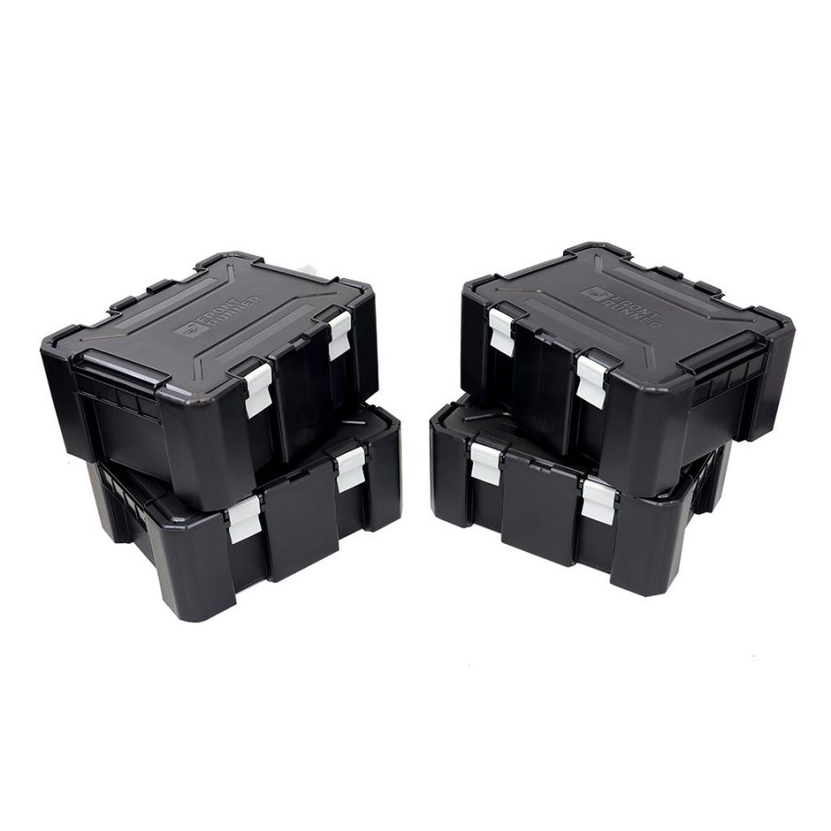 These plastic, workable sized storage boxes are easy to arrange in a cargo bed and vertical-sided to avoid wasted space. They stack securely for convenient storage in your vehicle thanks to the lids fitting neatly into the base of the box above it. A set of 4 Wolf Pack Pro storage boxes. Made from black, impact-resistant plastic. Features new extra-secure latches sealing the Wolf Pack Pro. Integrated grips for easy carrying. Versatile. Use in the cargo bed, truck/boot, or on your roof rack. Suitable for exterior storage. Wolf Pack Pros form the heart of many Front Runner storage systems. The Front Runner Transit Bags hold 2-3 Wolf Pack Pros depending on Transit Bag size and Wolf Pack configuration.