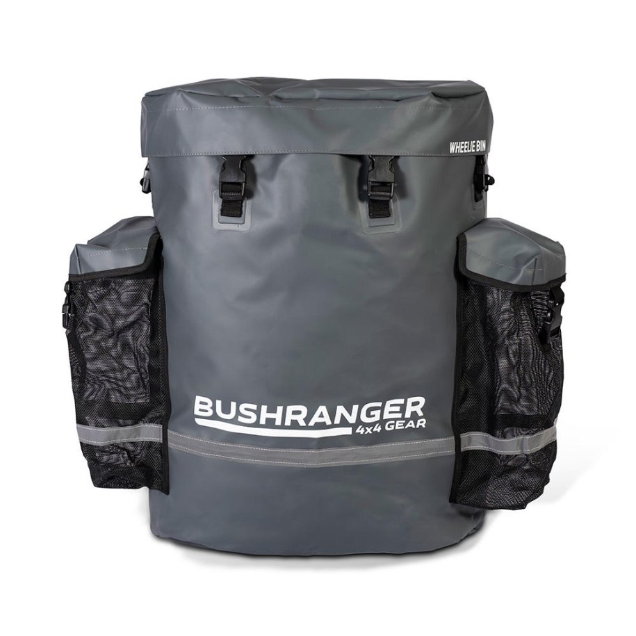 WHEELIE BIN, WITH CENTER DIVIDER Designed for rugged performance and convenience, the main compartment offers a sturdy, self-supporting 57L capacity with an adjustable divider for flexible storage options. Two additional 5L side pockets boost the total storage capacity to 67L, while drainage eyelets at the base help liquids flow out easily.Made from ultra-durable, reinforced 1000D PVC with a double-thick padded base and partial walls, the Wheelie Bin is built to last. Its expanded flap shields contents from dust, while a reflective strip adds visibility and safety in low-light conditions.The lid stays firmly in place with four 25mm side-release buckles, offering easy access and secure closure.Easy to attach, remove, and hose down after a big day out, the Bushranger-« Wheelie Bin also has a 5-year warranty for added peace of mind.FEATURES: \tHard-wearing reinforced PVC that is simple to hose down after use.\tVersatile fitment with highly adjustable straps to fit a wide range of wheel sizes.\tEasy to install and remove.\t57L main compartment, with a moveable centre divider. Two 5L side pockets. (Total 67L capacity).\tUV tested in Australia to stand up to colour fade and wear.\tReflective strip for extra night visibility and safety.\tSecure lid, keeping unwanted dust and critters out.\t3 vented eyelets on the base for drainage and ventilation.\tDimensions: 45.5 x 19.5 x 64.5cm\tWeight: 2.3kg\t 5-year warranty.