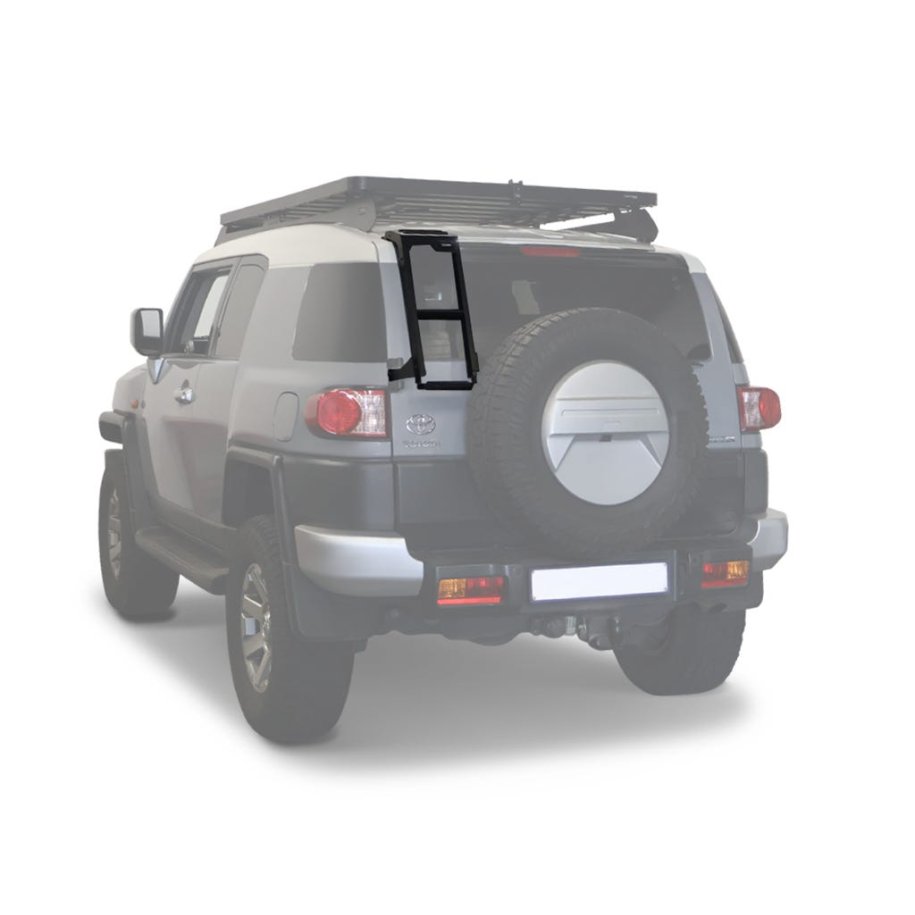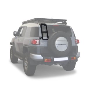 A three (3) step ladder for the rear hatch of the Toyota FJ Cruiser to access the cargo or sporting gear on your rack. The top of the ladder hooks over the top of the tail gate and fixes to the OEM spare wheel bracket mounting points, no drilling or vehicle modification required. Contains rubbers grips on the top and bottom steps. Made with off-road tough black powder-coated high-strength steel and aluminum for maximum durability and strength. Fitment guide and installation hardware included. Note: The rear hatch window is not operational when this ladder is installed.