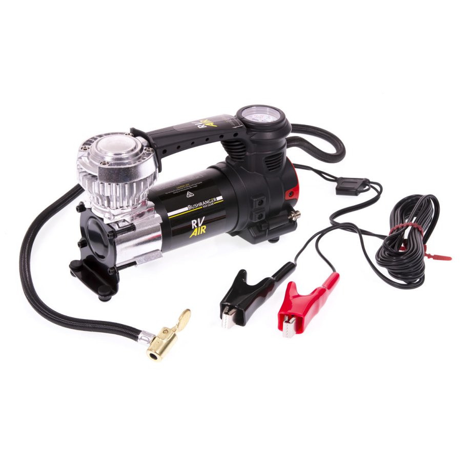 The Bushranger-« RV Air Compressor has been a staple in the Bushranger for many years and it's stood the test of time. This little workhorse is backed by our 5 year warranty.Our compressors comes in handy little piece of equipment when you're on the open road, suitable for inflating tyres up to 31ÔÇ?; 4+?4, SUV, compact, touring, passenger or motorcycle tyres.Features:\tFlow rate 52 LPM\tMaximum pressure: 60 psi\tBuilt-in pressure gauge\tGearless direct drive motor\t4.5m power cord with battery clamps and Inline fuse\tBuilt-in LED work light\tThree piece Inflation needle kitSpecifications:\tSuits: For tyres up to 31ÔÇ?: 4x4, SUV, compact, touring, passenger or motorcycle tyres.\tFlow Rate: 52 LPM\tWorking pressure (max): 60 psi\tDuty cycle (max): 20 min.