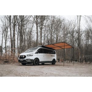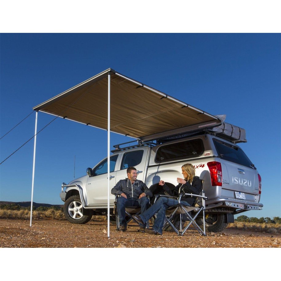 AWNING Quick as a flash and your awning's up. Retractable and reliable. Simple set-up and operation. Fits onto the side of roof racks and roof bars, and stores neatly in a sturdy PVC bag. Features:\tConstructed from tough PU-coated 300gsm polycotton ripstop canvas \tFully waterproof and offers a UVP 50+ rating \tFlexi joint arm knuckle\tAnodised height-adjustable telescopic legs \tVelcro-« ties to secure roof \tThick reinforced aluminium extrusions \tIncludes pegs and guy ropes for securing legs