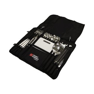 These are not your typical cheap, and easy to break, ''throw away'' camp utensils.The composite handles offer a comfortable and ''weighty'' grip.Triple riveted knife handles with double riveted fork and spoon handles.Professional forged knife blades with black comfort grip poly handles.The steak knives feature high quality, micro-serrated edges. CONTAINS:4 x serrated knives4 x steak forks4 x dessert spoons4 x tea spoons1 x chopping board1 x paring knife1 x bread knife1 x carving knife1 x serving spoon1 x spatula1 x tongs1 x Bottle opener and corkscrew1x Storage bag The entire kit fits in a custom tool-style roll with flap, adjustable straps and buckles, and carrying handles. Also features loops with carabiners so the opened roll and utensils