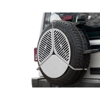 This ingenious, stainless steel cooking grate, stores over your spare wheel and takes up virtually no space. Laser cut steel grill on aluminum legs. Grill and griddle sections for campfire cooking options. Hooks over a spare wheel (secure with LADD007, STRA019 or wheel cover - not included). Fits 29” to 37” tyres (740mm to 890mm). Please Note: This Spare Tire Mount Braai/BBQ Grate is designed to be used for cooking purposes over coals and not used over high flames.
