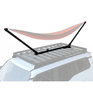 A Hammock holder that can be fitted on your rack for a moment to unwind. This Hammock holder is secured onto your roof rack with arms that pivot out and secure into place with supplied hardware. Designed to accommodate various types of standard length hammocks. Low profile design allows you to leave the hammock holder mounted on your rack when not in use. Made of high strength steel and finished with the same durable, corrosion resistant black powder coating as the Front Runner Rack. Safely holds maximum load of 110 kg / 242.5 lbs. Includes all necessary hardware to securely attach your hammock. Store your hardware in a safe place. NOTE: Hammock Holder fitment requires 8 open slats.
