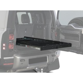 Mounts to the existing tie-down points in the bed of the Land Rover 110 (L663). Drilling is not required for installation. Secure up a fridge up to 52L in size, with room to spare for various camping items, or Front Runner’s storage solutions, such as the SBOX031 or SBOX001. Dual-latching lock securely keeps the unit closed and prevents rattling during travel. Features multiple tie-down points for STRA034 or other types of storage straps. Load rating: 113 kg/250 lbs. Finished with the same durable black powder coating as Front Runner Roof Racks and other Front Runner products. Note: This Cargo Slide cannot be installed together with a TBRA034. Note: The OEM Flat Loadspace Floor Tray cannot be accessed once this Cargo Slide is installed.