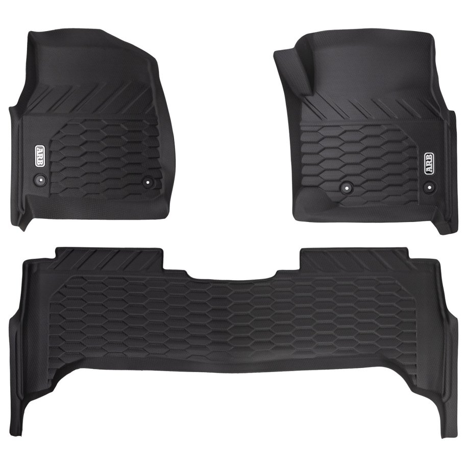 ARB FLOOR MATS Designed by ARB with an engineered 2-stage floor protection system that captures dirt, debris and water. The designated catchment areas in the floor mat is designed to capture any foreign material which provides complete protection to your vehicles floor. The second stage provides drainage channels which directs moisture to an additional catchment zone thereby preventing slippage while driving.Features & Benefits:• Vehicle and model specific• 100% waterproof and simple to clean• 3D moulded to each vehicle for a perfect fit every time• Made from thermoplastic elastomers that provide all the benefits of rubber without the odour• Two-stage design for secure foot placement, reduced spillage and complete protection• Unique surface texture designed and moulded for a secure grip over the entire surface• Seamless edging to integrate with vehicle's interior• OEM-compatible safety retention clips• Engineered debris channels that disburse material towards catchment zones• Includes one driver mat, one passenger mat and a full single rear mat CLEANINGARB Floor Mats are 100% waterproof and are designed to capture all kinds of debris from sand and dirt to mud and snow. The moulded deep dish design can be easily cleaned. Simply wipe or hose off any debris, dry and then place back in the vehicle ready for the next adventure.