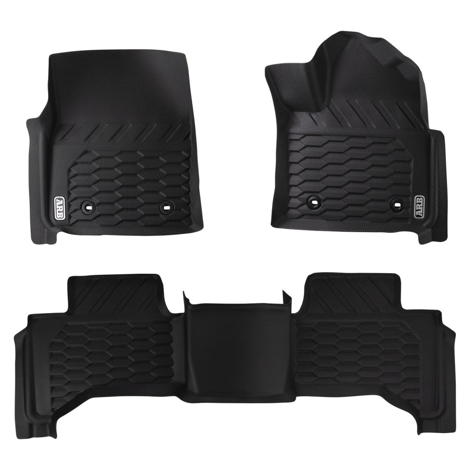 ARB FLOOR MATS Designed by ARB with an engineered 2-stage floor protection system that captures dirt, debris and water. The designated catchment areas in the floor mat is designed to capture any foreign material which provides complete protection to your vehicles floor. The second stage provides drainage channels which directs moisture to an additional catchment zone thereby preventing slippage while driving.Features & Benefits:• Vehicle and model specific• 100% waterproof and simple to clean• 3D moulded to each vehicle for a perfect fit every time• Made from thermoplastic elastomers that provide all the benefits of rubber without the odour• Two-stage design for secure foot placement, reduced spillage and complete protection• Unique surface texture designed and moulded for a secure grip over the entire surface• Seamless edging to integrate with vehicle's interior• OEM-compatible safety retention clips• Engineered debris channels that disburse material towards catchment zones• Includes one driver mat, one passenger mat and a full single rear mat CLEANINGARB Floor Mats are 100% waterproof and are designed to capture all kinds of debris from sand and dirt to mud and snow. The moulded deep dish design can be easily cleaned. Simply wipe or hose off any debris, dry and then place back in the vehicle ready for the next adventure.