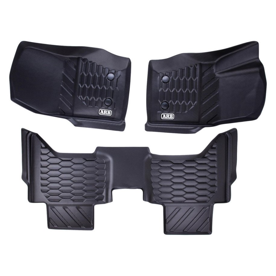 ARB FLOOR MATS Designed by ARB with an engineered 2-stage floor protection system that captures dirt, debris and water. The designated catchment areas in the floor mat is designed to capture any foreign material which provides complete protection to your vehicles floor. The second stage provides drainage channels which directs moisture to an additional catchment zone thereby preventing slippage while driving.FEATURES:• Vehicle and model specific• 100% waterproof and simple to clean• 3D moulded to each vehicle for a perfect fit every time• Made from thermoplastic elastomers that provide all the benefits of rubber without the odour• Two-stage design for secure foot placement, reduced spillage and complete protection• Unique surface texture designed and moulded for a secure grip over the entire surface• Seamless edging to integrate with vehicle's interior• OEM-compatible safety retention clips• Engineered debris channels that disburse material towards catchment zones• Includes one driver mat, one passenger mat and a full single rear mat CLEANINGARB Floor Mats are 100% waterproof and are designed to capture all kinds of debris from sand and dirt to mud and snow. The moulded deep dish design can be easily cleaned. Simply wipe or hose off any debris, dry and then place back in the vehicle ready for the next adventure.