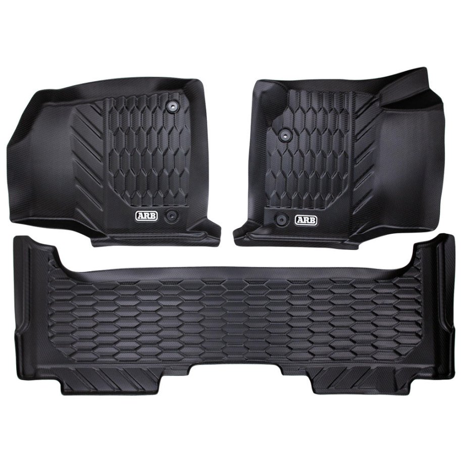 ARB FLOOR MATS Designed by ARB with an engineered 2-stage floor protection system that captures dirt, debris and water. The designated catchment areas in the floor mat is designed to capture any foreign material which provides complete protection to your vehicles floor. The second stage provides drainage channels which directs moisture to an additional catchment zone thereby preventing slippage while driving.Features & Benefits:• Vehicle and model specific• 100% waterproof and simple to clean• 3D moulded to each vehicle for a perfect fit every time• Made from thermoplastic elastomers that provide all the benefits of rubber without the odour• Two-stage design for secure foot placement, reduced spillage and complete protection• Unique surface texture designed and moulded for a secure grip over the entire surface• Seamless edging to integrate with vehicle's interior• OEM-compatible safety retention clips• Engineered debris channels that disburse material towards catchment zones• Includes one driver mat, one passenger mat and a full single rear mat CLEANINGARB Floor Mats are 100% waterproof and are designed to capture all kinds of debris from sand and dirt to mud and snow. The moulded deep dish design can be easily cleaned. Simply wipe or hose off any debris, dry and then place back in the vehicle ready for the next adventure.