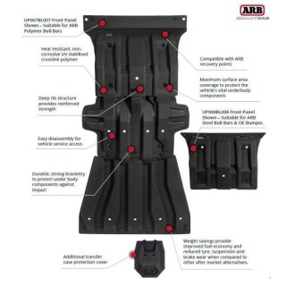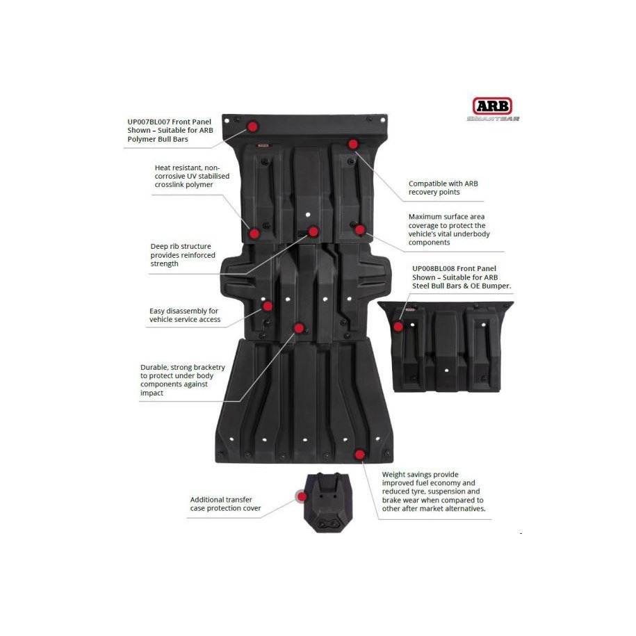 UNDER VEHICLE ARMOURWhen traveling off-road, the underbody of your 4WD is one of the areas most susceptible to damage. Whilst most factory protection is sufficient for protecting your vehicle from light stone damage, a more robust solution should be considered for increased protection from rocks, stumps and ruts encountered in more challenging terrain.SmartBar's Under Vehicle Armour (UVA) offers vehicle specific under vehicle protection, set to minimize the risk of damage to most vital components of your vehicle drivetrain in such environments.A complete replacement of the vehicle's OE skid pan, SmartBar's UVA offers superior under vehicle protection.