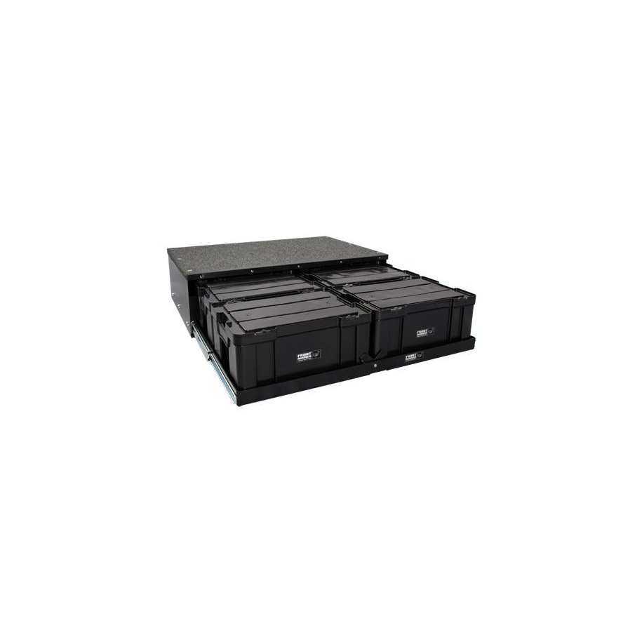 If Front Runner doesn’t offer a vehicle-specific drawer kit for your make and model vehicle, consider this “universal” drawer kit. Since these drawers will only fit into appropriately sized vehicles, please see SPECS for exact product measurements. This specific drawer kit was designed to fit into vehicles with a smaller than usual cargo area. This 4 Cub Box Drawer / Wide kit includes a sliding drawer system, latch mechanism and detailed fitment instructions. SBOX001, the heart of this modular storage system, are perfectly sized for kitchen support, dried goods, tools, camera gear, toiletries, even cloths. These latch-to-close, stackable and durable Cub Pack storage containers are made from black, high strength plastic and have integrated grips for easy carrying. High-strength bearing slides allows the drawer to extend nearly 100% from the anchored base. Fitted with a latching mechanism, the drawer is kept in place when in the closed position. 113kg/ 250 lb per drawer load carrying capacity. The flat deck allows you stack 150kg / 331 lb of gear across the surface. Customize your own storage configurations. Stack and secure luggage, SBOX031, SBOX001, aluminum boxes and other storage containers to the upper deck using STRA034 or other straps as well as RAIL007 and RRAC012. Finished with the same durable black powder coating as the Front Runner Slimline II Rack. The 4 Cub Box Drawer / Wide can be easily installed. Depending on your vehicle’s make and model, drilling may be required. All Front Runner Storage Systems are backed by a 2-year warranty. Note: These “universal” drawers do not come with a vehicle specific deck completion set or faceplates.If this Drawer system is not mounted onto a rigid surface, we recommend adding SSCA021 or SSCA020.If you have any questions about whether or not this product will fit your vehicle, please contact Front Runner before purchase.*Please Note: Cub Packs are not included when purchasing this Drawer System and are sold separately.Please Note: Installation of this product requires a Rivnut tool. We suggest using the VACC016.