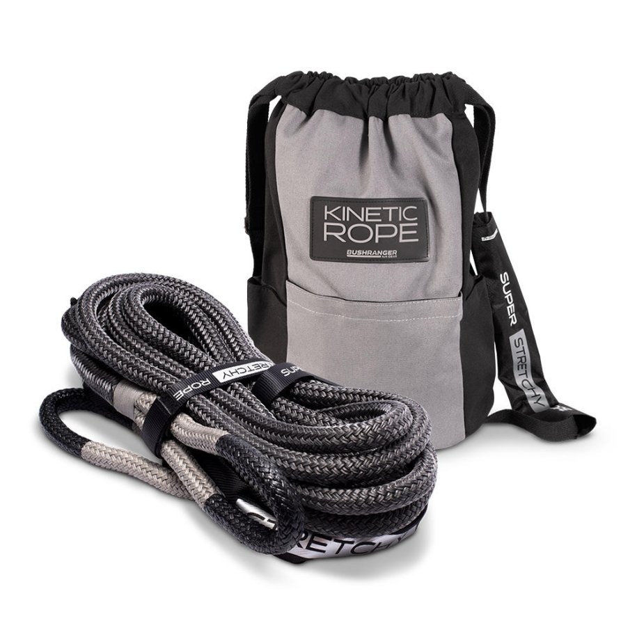 KINETIC ROPE Perfect for vehicle recoveries in soft or loose terrain such as snow, sand and mud. The Bushranger Kinetic Rope aka the Super Stretchy Rope, is an effective and practical addition to your recovery kit. Stretching approximately 30% of its original length, the Super Stretchy Rope reduces the shock typically experienced when recovering vehicles using snatch straps. This ability to stretch allows for the rope to build more momentum, which in turn generates a higher pulling force, whilst simultaneously absorbing the forces that put stress on you and your vehicle. Making for safe, smooth and effective recoveries. FEATURES: • 8,000kg rated capacity, 9 metre length (unstretched), 25mm diameter• Stretches approx.