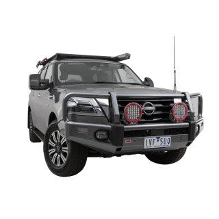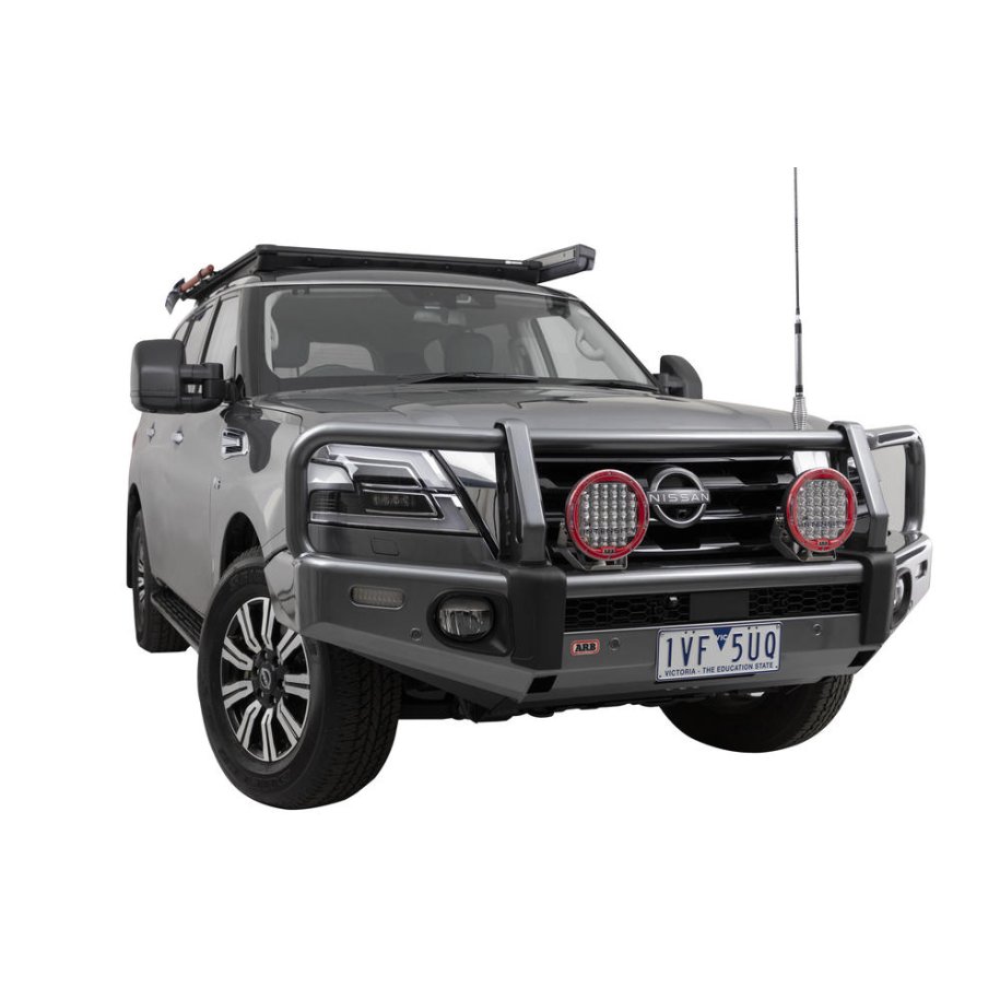SUMMIT BULL BARThe newly developed Summit bar for the Y62 is compatible with both winch fitment and the Intelligent Cruise Control (ICC) system and suits the Ti trim specifications. At time of publication the Ti-L specification retains the original grill design and the original Summit bar 3427040 is a better suited fitment.• Front and rear parking sensors• Intelligent Around-View-« Monitor (AVM) with Moving Object Detection• Autonomous Emergency Braking (AEB)• Intelligent Cruise Control (ICC)• Intelligent Forward Collision Warning (IFCW)• Lane Departure Warning (LDW) and Intelligent Lane Intervention• Blind Spot Warning (BSW) and Intelligent Blind Spot InterventionWhilst previous Y62 bars have been bumper replacements, the Y62 Series 5 ARB bar retains the top sectionof bumper to maintain location and operation of the original equipment headlight washers. FEATURES:• Summit Winch bar design compatible for Ti Series 5 2022 Nissan Patrol Y62• Registered design of styling and design components• Durable steel construction for maximum protection• Incorporates ARB's renowned multi fold upswept and tapered wing design for optimum strength andapproach angle• ARB developed, engineered and manufactured airbag compatible mounting system secures to thechassis with a combination of M8, M10 and M12 fasteners• 3 piece grill for split pan. Split pan design for maximum strength and airflow• Extensive protection panels on centre and either side• Pressed formed top pan and aluminium (powder coated matt black) winch cover panel• Twin ARB Jack or Hi-Lift jack points located beneath each buffer• Includes ARB LED Indicator and Clearance light• Two aerial brackets located on the top of the centre tube• Will accommodate Warn, Magnum, Bushranger, Smittybilt low mount model electric winches up to12,000lb• Winch Roller Fairlead Cover PN 3501080 under development• Provision for OE parking sensors and Intelligent Cruise Control• Provision to accommodate ARB Intensity and Solis LED's and a range of Bushranger lights• Provision for optional ARB LED fog light PN 3500910. Refer fog light section below for additional partsrequired. Note that there is no option to fit factory fog lights for this bar.• Bar adds approximately 198mm to the overall length of the vehicle• Approximate weight of the bar, chassis mounts and fitting kit is 99kg. Approximately 18kg is removedfrom the vehicle for fitment of the bar• Metaprep primer for additional corrosion resistanceFinished in matt black powder coat with the option to colour code to vehicle colour