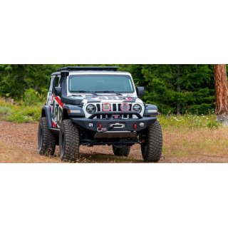 ARB BONDI DELUXE BUMPER Inspired by the popular classic ARB TJ Wrangler bumper styling, ARB has designed a completely new look bumper to suit the JL. Ruggedness is ensured by the new single piece, press formed centre pan perfectly complemented by a bash plate underpanel. Further protecting the vulnerable engine components is a low slung, forward facing 76.1mm top tube.The new Bondi Deluxe Winch bar is recovery ready with two highly visible red chassis mounted, 8T rated recovery points and centrally located high lift jacking points.FEATURES: \tVehicle specific design to complement the Jeep Wrangler JL\tDurable steel construction for maximum protection\tSingle-piece press formed centre pan\tBash plate under panel included for added protection finished in vintage silver\tTwin high lift jack points in the bar perfect for use with ARB Jack or a mechanical jack\tTwo aerial or driving light brackets located on the top of the centre tube\tWill accommodate Warn, Bushranger and Smittybilt low mount model electric winches up to 10,000lbs\tProvision to accommodate ARB Intensity LED's and a range of Bushranger lights\tProvision for OE Fog Lights. Refer fog light section below for additional parts required Brackets provided to accept either OE halogen or OE LED fog lights\tDual chassis-mounted recovery points, powder-coated red for maximum visibility\tBumper adds approximately 34mm to the overall length of the vehicle\tApproximate weight of the bumper, chassis mounts and fitting kit is 143lbs\tApproximately 42lbs is removed from the vehicle for fitment of the bar\tZinc rich primer for additional corrosion resistance, followed by a textured Integrit black powder coat finish\tChassis mounts manufactured with 5mm sheet steel\tSeparate winch cradle manufactured from a combination of 4mm and 5mm sheet steel\t76.1mm forward-facing top tube\tWings and pan manufactured from 3mm sheet steel including press forms and multi folds for added structural integrity\tWings designed to suit the flares of Rubicon models will also suit Sport and Sahara models with Rubicon or aftermarket front flares fitted\tUprights manufactured from laser-cut 4mm sheet steel\tFog light brackets provided to accept either OE halogen fog lights or OE LED fog lights