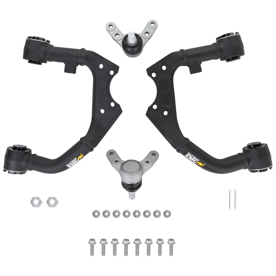 Upper Control ArmsAvailable for a range of popular 4WDs to ensure correct alignment of the front suspension and cater for the geometry change when an IFS vehicle is fitted and lifted with a suspension kit, Old Man Emu Front Upper Control arms have been engineered for use with Old Man Emu Suspension & GVM upgrades and include a forged ball joint housing, free pivoting grease and maintenance-free GIIRO bushings.When an Independent Front Suspension (IFS) vehicle is fitted with a suspension lift, the caster and camber can be pushed outside the factory specifications. IFS vehicles generally have a few degrees of adjustment in their camber and caster from the factory.